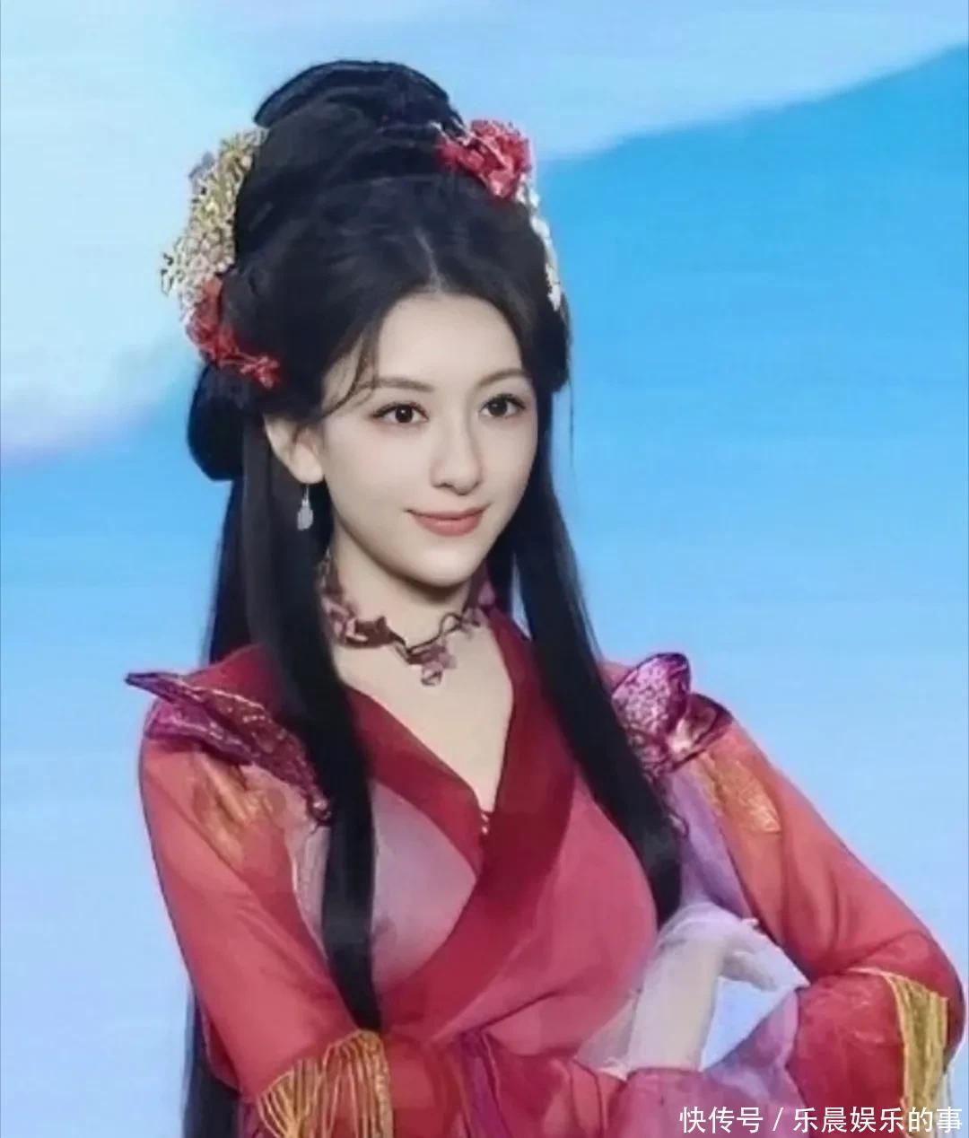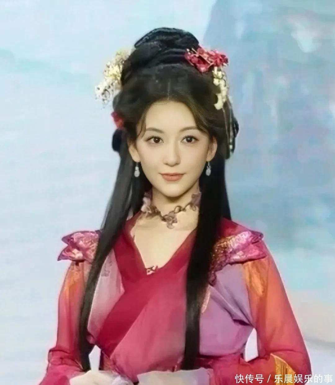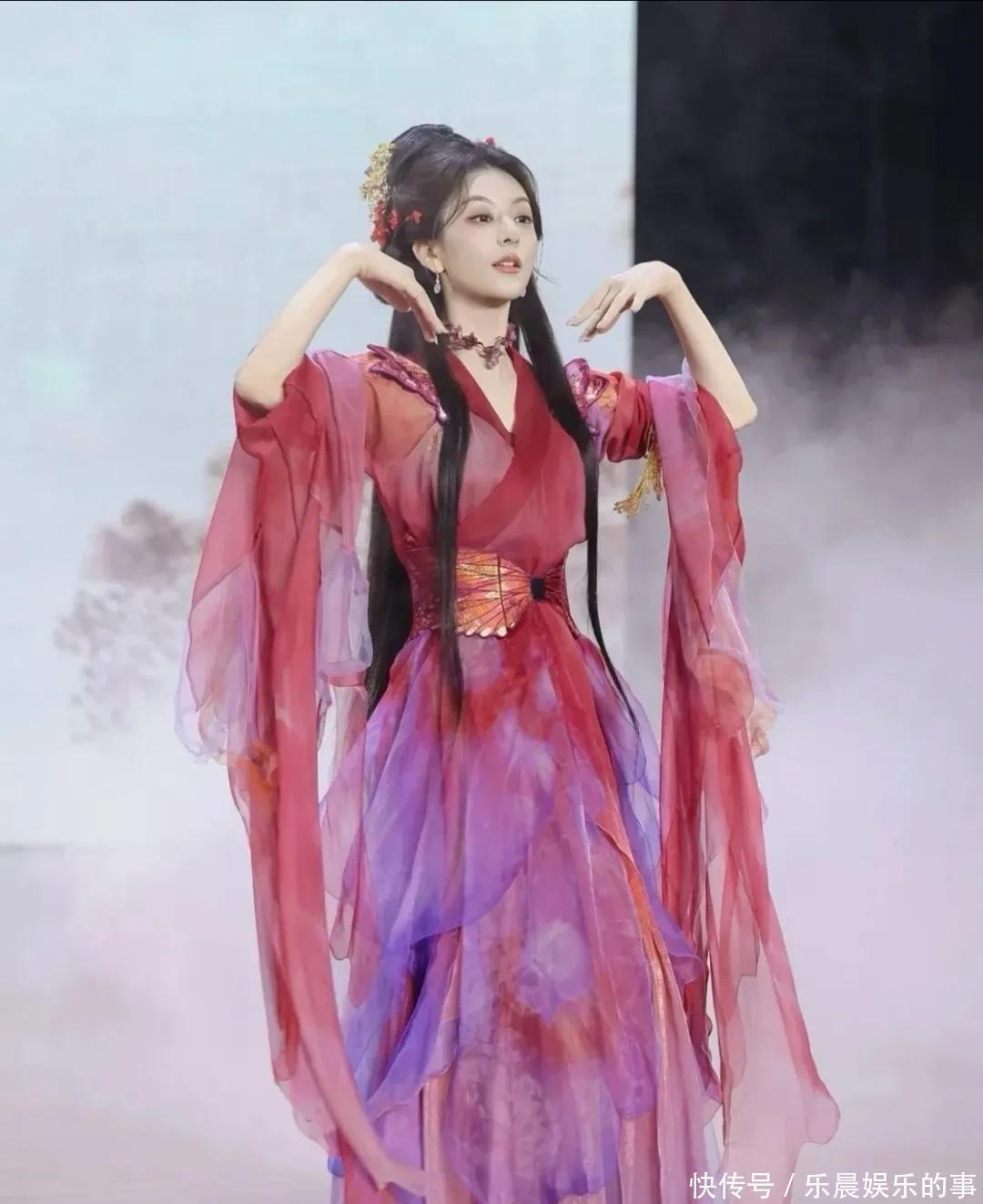 方媛穿着红紫相间的轻薄纱裙,这大概是她头一回尝试古风造型。头发高高盘起,身姿婀娜,配上那张宛如古典画中走出的美人面庞,真是飘逸如仙。